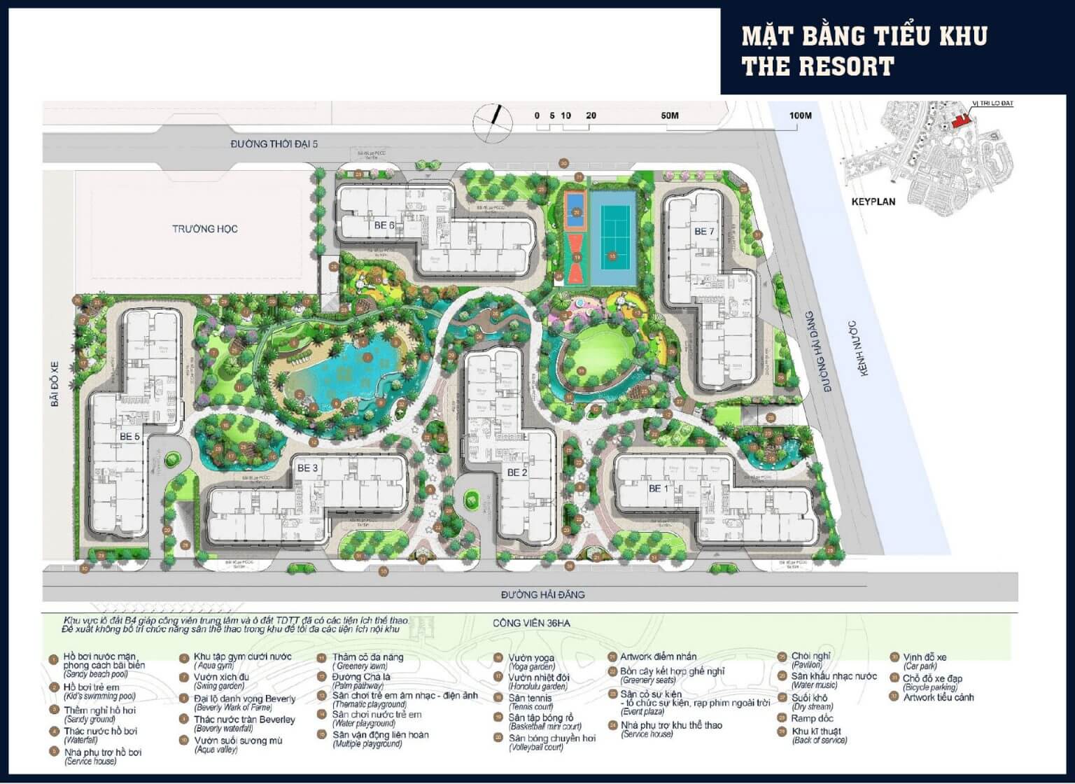Dự án hướng đến hệ sinh thái nghỉ dưỡng với hơn 70% diện tích tiểu phân khu The Resort (trên 30.000m²) dành cho cảnh quan và giao thông, nổi bật với hồ bơi nước mặn mang “bãi biển trên không” đến cư dân. Các tiện ích chính bao gồm: